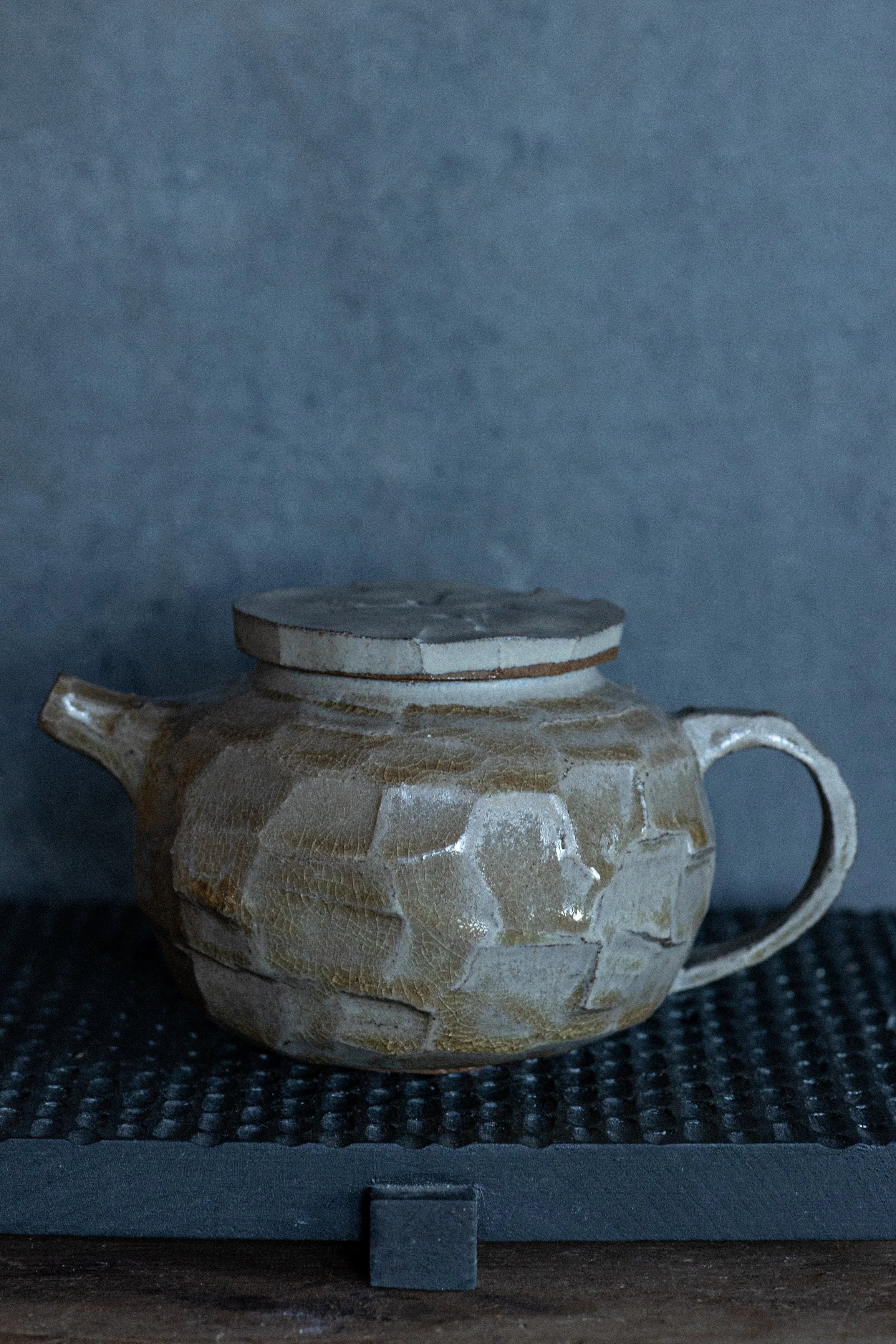 Wheel thrown teapot in mixed stoneware clay. Wood-ash glaze inside. Metal handle.